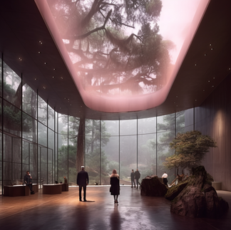 Prompt: the gallery space where artwork is hanging on the walls of an architecturally designed art gallery in a misty lit forest mossy where the facade is straight glass panels and the roof is a low hung pink hue coloured cloud. Jeames Hanley - Midjourney